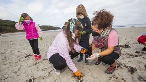 16 oct 2021 . Actualizado a las 10:13 h.Niños de los colegios de A Laracha y estudiantes del IES Maximino Romero de Lema de Baio participaron ayer en la limpieza simultánea de playas convocada por la entidad ecologista Adega, que aglutinó cerca de una treintena de iniciativas por todo el litoral gallego.