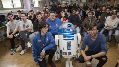 18 may 2022 . Actualizado a las 16:33 h.Alumnos del IES Isidro Parga Pondal de Carballo pudieron conocer ayer a R2-D2, el mítico robot del universo «Star Wars». No era el auténtico, pero se le parecía mucho: hecho íntegramente con impresora 3D, con motor de patinete (alcanza los 30 kilómetros por hora), con una radio de coche industrial y un amplificador de guitarra. Así lo contó Eduardo Santos, de Cambre, quien también detalló que quizás pronto tenga un brazo y que se le irán añadiendo modificaciones «para que sea el de la película»: «Es completamente funcional», añadió. De la mano de R2-D2 Builders Spain y de Project Droid, en el centro se acercaron a la robótica, al software, al hardware, a la cultura maker o al reciclaje. Eduardo, de hecho, hizo su primer proyecto con material reciclado, desde motores de Roomba a palos de escoba o tapones de leche: gracias a ello conocieron a Pedro Duque.