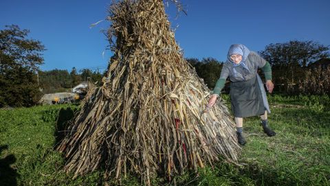 Como María, que tamén decide ter os millo medado durante dez ou quince días. Unha maneira de traballar distinta á de outros concellos, onde sempre se preferiu esfollar canto antes, e ir cortando segundo se vaian gardando as espigas ou mazorcas. O de ter as medas feitas durante días era de tempos máis remotos. María di que prefire facelo así para que vaia secando mellor. E xa non vai cambiar. Non lle gustas as novas (levan moitos anos por determinadas zonas) técnicas de cortar só a metade e ir sacando as espigas pé por pé. E tamén de pé. O mellor, di, o de sempre: sentarse no tallo arredor da meda e con paciencia. Tampouco lle gusta a calidade do que está vendo este ano: «Moi ruín, como as patacas, ás que lle chegou a peste». En canto ás espigas, combina as de sempre (gran duro, malas esfollar e de partir, coa casula dura) coas amarelas, mellores de traballar, «e ademais ás galiñas préstalles mellor». Foi outro dos cambios importantes: xa non se escollen as mellores, algunhas de cores rechamantes, como aquelas que parecían repinaldos. Se tiñan o bico ben posto, sen que se vise o cadolo, tiñan asegurada a semente do ano seguinte. Agora todas son iguais e o millo xa se compra de boa calidade. Mesmo se bota dunha maneira algo máis ancha para aqueles que prefiren que sexan as máquinas (non as de silo, as de corta e esfolla) as que fagan todo o traballo. María di que non lle ten ningún medo a facelo, e ata lembra cando emigrou co seu home (falecido hai uns 15 anos) a Inglaterra durante 22 meses para xuntar algo de cartos a facer a súa casa: «Nós, coas nosas mans».