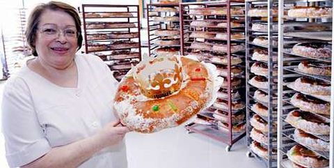 Ayer se vendieron muchos roscones de Reyes, y hoy serán más. Uno de los clásicos es el de la panadería Roiser de Coristanco, con clientes de toda la provincia. Manolita Rey Andrade, la hermana de la dueña, Pilar, muestra uno de estos dulces compuestos de harina, huevos, leche, sal, mantequilla, levadura, azúcar y agua de azahar. La clave está en los tiempos y en la mezcla. foto ANA GARCÍA