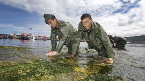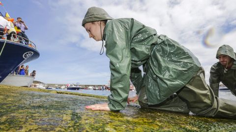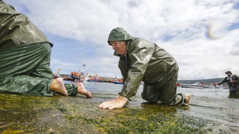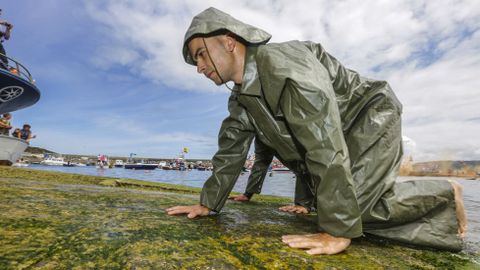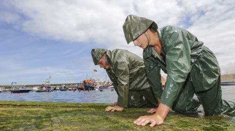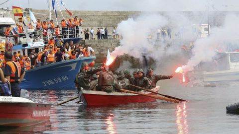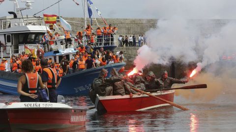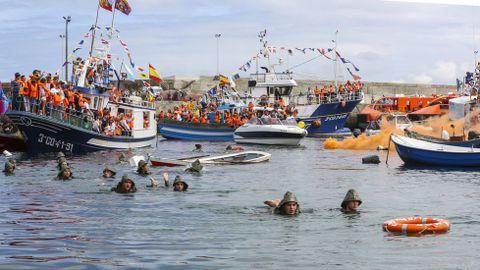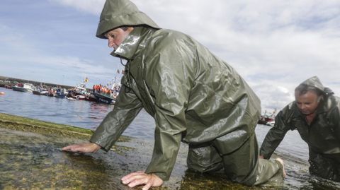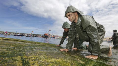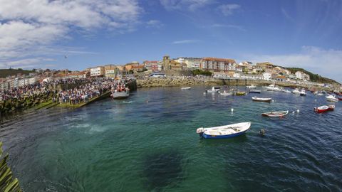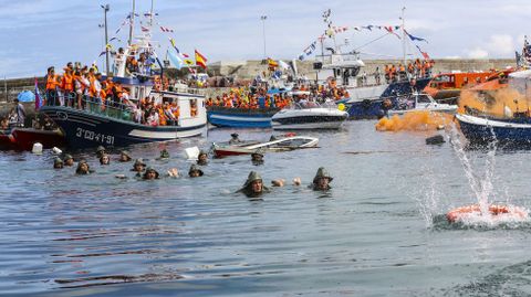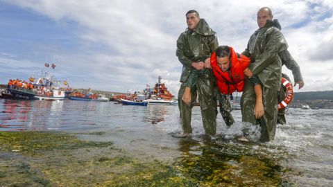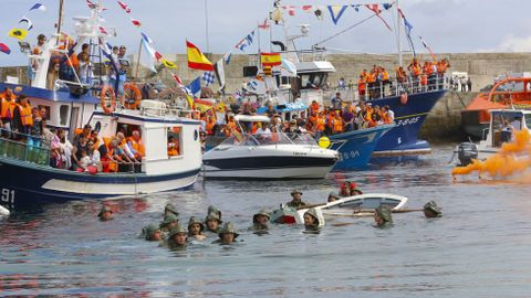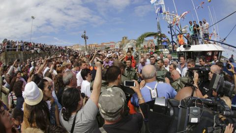 Diez fueron los marineros que aguardaban el momento de echarse a la mar mientras su barco se perdía en las profundidades del puerto laxense. Entre ellos, por primera vez, había dos mujeres. Se hizo de rogar la santa, que enfiló la rampa del puerto pasada la una y media. Fue entonces cuando los náufragos encendieron sus bengalas para alertar de su desgracia. Nueve llegaron sanos y salvos a tierra, extenuados por el esfuerzo realizado. Pero uno se hallaba malherido. Cuatro compañeros lo llevaron inerte en brazos a los pies de la santa para pedirle auxilio divino. El sol, que había permanecido escondido toda la mañana, no quiso perderse cómo la virgen obraba un año más el milagro y devolvía a la vida al desafortunado náufrago. Las miles de personas que presenciaban la escena estallaron de júbilo por lo acontecido, agradeciendo a la santa la protección a los marineros durante sus travesías y faenas.