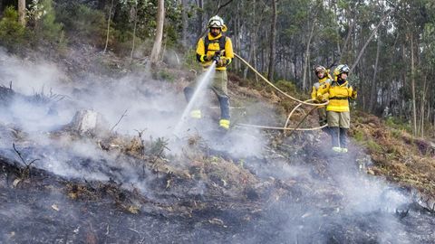 A primera hora de la mañana de este lunes seguía activo, pero controlado, el fuego en las inmediaciones de la playa de A Barda