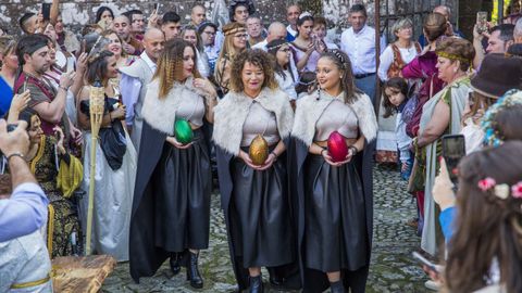 Entre los invitados hubo de todo: disfraces recatados, unas damas de honor con trajes muy logrados, y algunos que tiraron más por el medievo que por la serie. También dos o tres que, disfrazados de los intimidantes dragones de la serie, daban risa, más que miedo. «No banquete uns vestíronse de hawaianos, tamén un de dothraki cunha sulfatadora...», «Foi unha pasada ver a todo o mundo disfrazado», relatan.