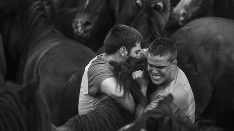 «Houbo varias cousas que me chamaron moito a atención. Unha foi a loita de igual a igual. É certo que os cabalos poden estar nerviosos e verse acurralados no curro, pero non vin ningún cabalo en perigo e ese día si que vin saír un aloitador en camilla e marchar en ambulancia ao hospital», cuenta Marcos Rodríguez. «Tamén me pareceu curioso que os aloitadores levaran o nome na camiseta e o público os animase chamándolles polo nome. Nunca vira algo igual», cuenta. «Outra cousa que me chamou a atención é que entre dúas ou tres persoas tiraban unha besta. Tiña estado noutros curros onde se botaban oito encima e a besta seguía escapando. Supoño que en Sabucedo non serán superhomes, pero teñen unha técnica bárbara», explica el fotógrafo.
