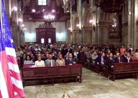 «Es el momento de dar un escarmiento generalizado a países como Irak, Sudán o Afganistán», reclama Vázquez Las barras y estrellas ondearon ayer a media asta a los pies de San Jorge. En una insólita estampa, la bandera norteamericana lucía ayer junto al altar del templo barroco, que acogió el funeral organizado por el Ayuntamiento de A Coruña «en memoria de las víctimas de los atentados terroristas en Estados Unidos», tal y como se recogía en la esquela publicada ayer en La Voz. Cerca de mil coruñeses abarrotaron el interior de la iglesia «para rezar y reflexionar», como apuntó el sacerdote en su homilía, por las víctimas de los brutales ataques contra las Torres Gemelas y el Pentágono. A Coruña entonó su particular oración por América.