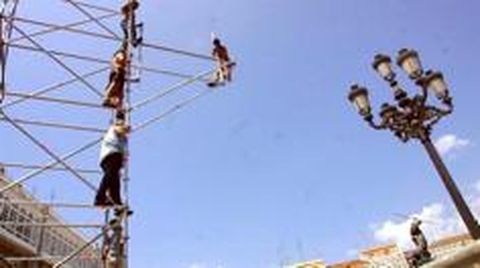 23 jul 2002 . Actualizado a las 07:00 h.La proverbial calma que rodea el espacio porticado de María Pita sucumbió ayer a la febril actividad. Decenas de obreros se multiplicaron durante toda la jornada para completar la nueva decoración de la plaza para el próximo mes de agosto. Mientras las contestadas terrazas siguen tomando forma con la colocación de sus paredes de cristal y las lonas de protección solar, el nuevo escenario para las actuaciones musicales del programa de fiestas no tomó su forma definitiva hasta bien avanzada la mañana. Cambio de ubicación Y ello, para desesperación de alguno de los vecinos afectados. Porque este año, el palco cambia de ubicación. Su tradicional situación a la izquierda de la fachada del palacio municipal ha dado paso a la instalación del armazón de hierro en la entrada a la plaza por Puerta Real. «Aquí viven muchas personas mayores y si el ruido ya era insoportable antes, ahora, con los grupos cantando debajo de la ventana de casa, no va a haber quien aguante en las noches de conciertos», protestaba ayer mismo uno de los afectados. Pero el escenario es ya inamovible. Las lonas negras tapan ya los laterales a la espera de que el polifacético Miguel Bosé dé el pregón. La misma cuadrilla de trabajadores se trasladará hoy a la playa de Riazor, donde se emplearán a fondo en la creación de un espacio similar en el concurrido arenal coruñés para los recitales gratuitos del verano.