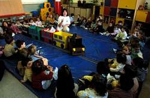 El tren de reciclaje es uno de los elementos más vistosos del programa ecológico. Con su máquina y sus vagones, el tren está situado permanentemente en el pasillo de la escuela y los niños depositan en él envases y otros desechos que traen de casa, separándolos por vagones en función de las características de cada residuo. En la imagen, los niños de dos y tres años escuchan las explicaciones de una profesora sobre los beneficios de la reutilización.