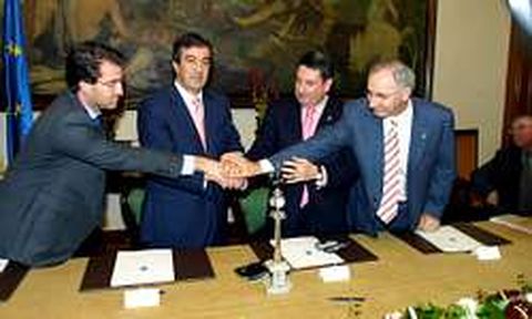 02 feb 2004 . Actualizado a las 06:00 h.«Alabado sea Dios», pero en latín. Ese fue el guiño de Francisco Vázquez a la Historia de A Coruña, dos iniciales con las que remató veinte líneas de declaración institucional en el libro de oro de la ciudad. Allí, desapercibidas, aparecieron las letras LD que decían mucho más que todo el párrafo anterior: Laus Deo. Bajo la inscripción firmó también un ministro al que ayer lo compararon con Linares Rivas. Francisco Álvarez Cascos cruzó María Pita en coche oficial a las once menos cuarto de la mañana, y tras firmar junto a Vázquez se encerró diez minutos. Una llamada urgente, se decía en el palacio municipal. El ministro y el alcalde, los dos de raya diplomática y corbata rosa, fraguaron luego entre churros Bonilla la firma más importante que se ha estampado en A Coruña en la última década. Y una vez estampado el convenio, Vázquez puso a Cascos a la altura de Linares Rivas. Por eso, detalló un miembro del gobierno municipal, le regaló un obelisco de plata con cuatro relojes de mecanismo impecable: «El Obelisco de Los Cantones se erigió en homenaje a Linares Rivas por traer el ferrocarril a La Coruña y Álvarez Cascos nos ha traído el puerto exterior», explicó. Los presentes (en ese momento los periodistas acampaban en otro salón del consistorio), juraron que Vázquez soltó una lágrima. «Se cumple un sueño que yo pensé que se iba a quedar en eso, en un sueño», dijo el alcalde. No hubo tiempo para más. Su gemelo de raya diplomática cogió un avión y dejó la ciudad de los obeliscos.