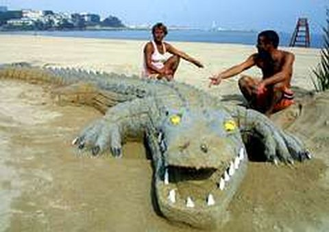 El pulso de la ciudad Joao Guerreiro y Mari Carmen Rodríguez recorren la costa española modelando en arena figuras de estos temidos reptiles. Uno de ellos llegó ayer a la playa oleirense