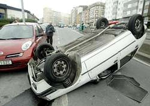 27 feb 2007 . Actualizado a las 06:00 h.Los ocupantes de un Peugeot 205 que circulaba por la avenida del Ejército hacia las cuatro y cuarto de la tarde de ayer se llevaron el susto de su vida cuando el coche salió despedido, dio una vuelta de campana y quedó con el techo apoyado sobre el pavimento. El espectacular accidente se produjo al chocar el vehículo contra el quitamiedos del viaducto de la avenida. El conductor del turismo -V.?P.?P., de 79 años-, que salía del túnel de los Castros, intentó desviarse a la izquierda al llegar a la altura de la gasolinera, pero impactó en el muro de hormigón, que, debido a su inclinación, hizo las veces de trampolín para que el coche volcase y además terminase golpeando a un Nissan Micra estacionado en la derecha de la calzada. En el interior del coche accidentado, viajaba, además del conductor, una mujer, de iniciales M.?S.?P.?F y de 82 años. Los dos ocupantes, que sufrieron lesiones leves, fueron trasladados al hospital Juan Canalejo en una ambulancia del 061 después de prestar declaración a la Policía Local. El accidente obligó a los agentes a cortar el carril de acceso a la glorieta, que permaneció cerrado al tráfico durante más de una hora, lo que provocó retenciones en el túnel y en los Castros. También se desplazó al lugar una dotación de bomberos, que procedió a limpiar el pavimento, ya que el vehículo siniestrado había derramado gran cantidad de aceite y combustible sobre la vía. Desprendimientos En la tarde de ayer instalaron protecciones metálicas en el edificio en ruinas situado en la esquina de las calles San Nicolás y San Andrés. Operarios contratados por la empresa propietaria del inmueble también retiraron fragmentos desprendidos de la fachada.