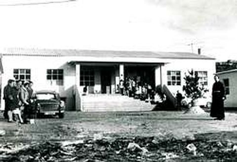 El fundador de la Ciudad de los Muchachos Agarimo tiene entre sus múltiples méritos el haber conseguido para los más desfavorecidos viviendas en la zona de Labañou. En la foto, el padre Villa posa frente a uno de esos inmuebles, con sus vecinos, en la entonces -1969-recién construida urbanización.