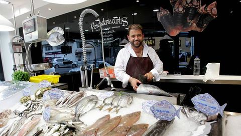 Lo tiene claro. Entre una buena carne roja y una dorada roja Nemesio Cotón Bermúdez se decanta por el producto del mar. «Prefiero comer pescado toda la semana y no carne, que aunque me gusta, me cansa más», comenta este carnicero de Santa Cruz que hace unas semanas inauguró una pescadería. «Antes de dedicarme a la carne trabajé en el muelle, así que sabía cómo era el mundillo», destaca. Hace 18 años abrió su primer negocio, el cárnico, que bautizó con el nombre de Curtis, su localidad de origen, y que con el paso del tiempo se convirtió en una referencia en la zona. Es de esos establecimientos familiares que supieron evolucionar con los tiempos y donde siempre hay gente desde la mañana hasta que el sol se pone por el castillo de Santa Cruz. ¿Y porqué un carnicero decide ser también pescadero? «Quería ofrecer algo nuevo, bueno, fresco y diferente porque creo que en Santa Cruz hasta ahora no había buen servicio. Yo, por ejemplo, me desplazaba a la plaza de Lugo a comprar el pescado», apunta Nemesio, que incluye en su oferta marisco cocido en el cocedero que instaló en su nuevo local.