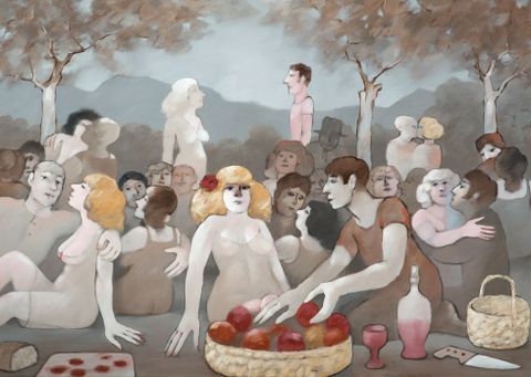 Y llega así a la etapa final, en los años ochenta, cuando se inclina por «unha figuración máis sarcástica, máis critica», valora el comisario de la muestra antes de concluir que en esa etapa «hai un certo distanciamento do seu proceso de creación, un aspecto reflexivo, con obras como Merenda no campo, que está cerca dun bucolismo non exento de tensión ou ironía».