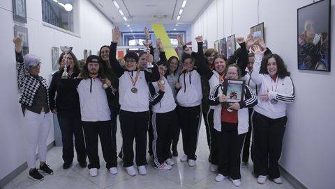Maribel Dapena habla con dulzura y seguridad. Se lo nota que es una apasionada de su trabajo. Rezuma felicidad con las medallas conseguidas por el Club de Gimnasia Rítmica Santiago Apóstol de la que es presidenta y alma máter. Regresó del Campeonato de España de Gimnasia Rítmica para Personas con Discapacidad que se celebró en Albacete tan satisfecha con las medallas conseguidas como por el hecho de que los jóvenes disfrutaron de un viaje que combinó lo deportivo con lo social. «Siempre que hacemos un desplazamiento largo procuramos completarlo con algo de ocio. Esta vez fuimos a Madrid a ver el musical Dirty Dancing. A los chicos les viene muy bien estar solos, sin sus familias, sentirse independientes», reflexiona. Sara, Gloria, Antía, Noelia Beatriz, Mónica o Patricia, las medallistas, fueron recibidas en la Casa-Museo Casares Quiroga por la concejala Rocío Fraga. Acudió Ricardo Prado, uno de los dos chicos que forman parte del equipo e hijo de la terapeuta ocupacional y pintora Encarna Díaz, que expone allí una serie de trabajos que buscan «hacer visibles a los invisibles».