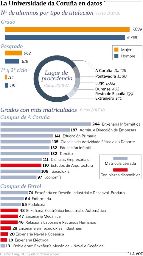 22 oct 2017 . Actualizado a las 22:45 h.Algo más de 16.000 estudiantes, más mujeres que hombres, formarán parte de la Universidade da Coruña (UDC) cuando se cierren los últimos plazos. Uno de cada tres procede de fuera de la provincia y Enxeñaría Informática se consolida como la titulación con más matrículas. Siguen siendo pocas. En 1997 la institución que había echado a andar solo cinco años atrás recibió a más de 27.000 jóvenes, su cima hasta hoy, desde la que fue menguando la entrada de alumnos. La crisis económica y demográfica y la extinción de los viejos planes de estudios, con diplomaturas de tres años y licenciaturas de cinco, explican la pérdida acelerada del último lustro.