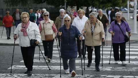 «Eu teño 42... en cada pata», apunta Elvira, que baja desde Bens para no perderse una actividad que «a dor non ma quita, pero mal non me fai». De las sesiones de marcha nórdica, con paradas para ejercicios en parques y plazuelas, agradece sobre todo «ver a moita xente e falar con todos, porque eu o que quero é falar».