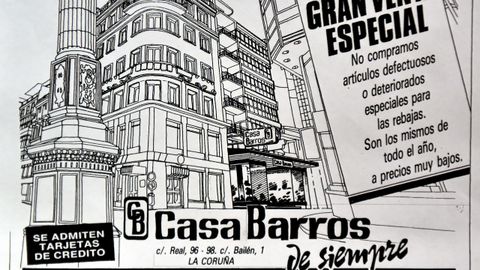 Con una cuidada ilustración de la entrada a la calle Real desde el Obelisco, con el reconocible letrero de Casa Barros, las galerías comerciales anunciaban el 10 de enero de 1989 el inicio de una «Gran venta especial». Y advertía: «No compramos artículos defectuosos o deteriorados especiales para las rebajas. Son los mismos de todo el año, a precios muy bajos». Y se añadía que en los establecimientos de Casa Barros (calle Real, 98 y Bailén, 1) se admitía el pago con tarjetas de crédito.