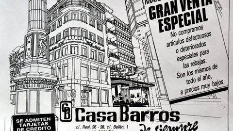 Creo que ninguno de los que tenemos más de 40 años nos hemos saltado la ilustración que el jueves de la semana figuraba en la agenda de este periódico. Se trataba de Casa Barros. En 1989 publicitaba aquí el arranque de su período de rebajas, dejando claro que no eran los mismos artículos que se vendían el resto del año a precios más altos o que -¡novedad!-, aceptaban pagos con tarjeta de crédito. De los que detuvieron la mirada ahí, ninguno habrá podido reprimir el viaje retrospectivo hacia una ciudad en la que Marineda City o Espacio Coruña ni siquiera se podían imaginar.