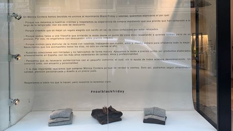 Y sin embargo hay espacio para todo. Desde el Black Friday de mercadillo al digital, pasando por los escaparates que han sustituido la ropa por un manifiesto en el que se explica por qué aquí no. Es el caso de Mónica Cordera, una diseñadora de moda que lleva dos años negándose a celebrar el último viernes de noviembre. Y este año lo ha plasmado en el escaparate de su céntrica tienda. «Por respeto a las clientas, porque nuestras producciones son muy limitadas», dice Mónica. «Y porque apostamos por un consumo sostenible», añade su hermana María. Para estas dos asturianas afincadas en A Coruña, el siguiente paso será dejar atrás el bucle de las rebajas.