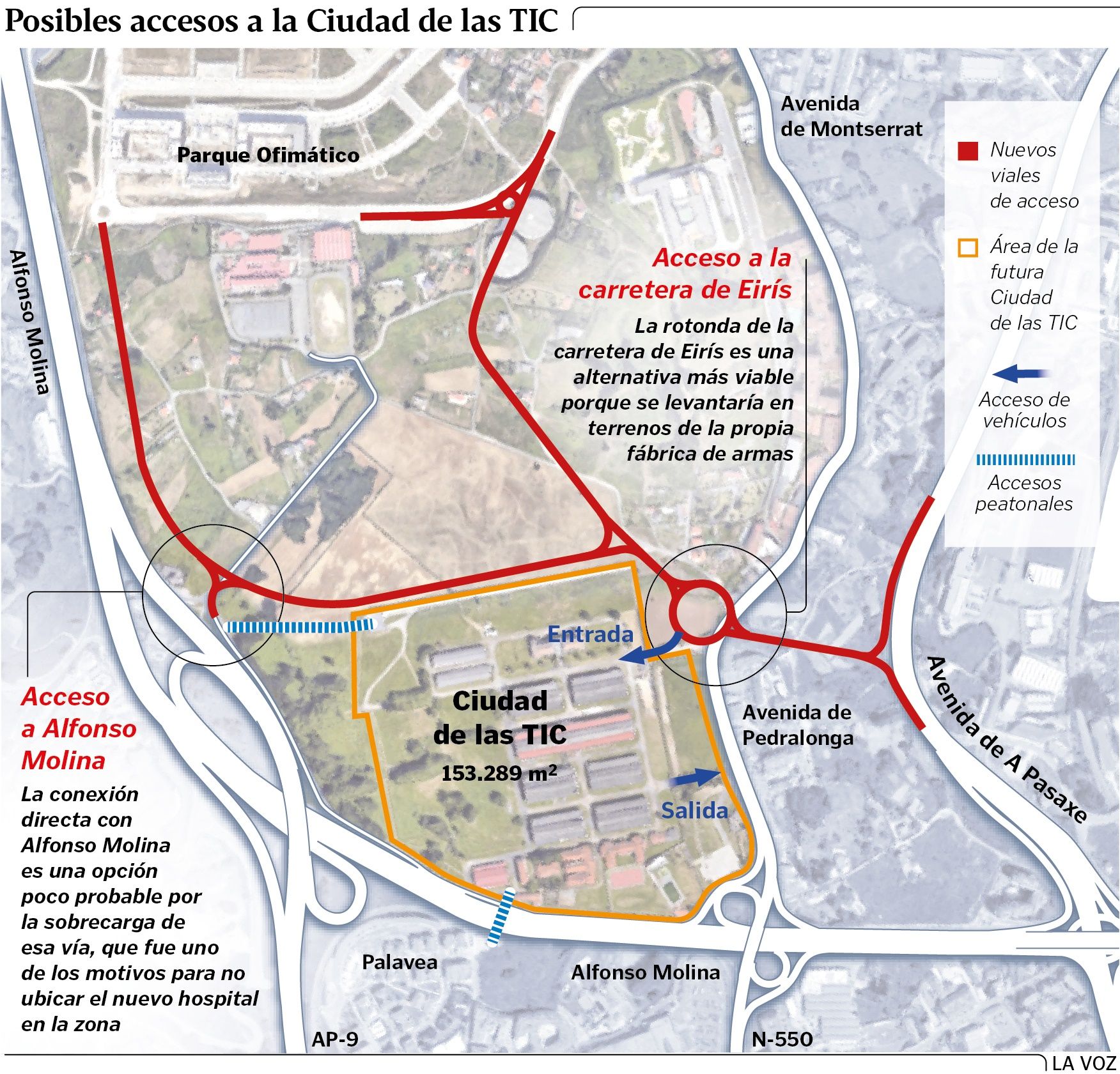 29 feb 2020 . Actualizado a las 05:00 h.El muro histórico de la fábrica de armas se romperá para abrir el paso a los ciudadanos. Sesenta años después del cierre del recinto militar de Pedralonga, los vecinos dispondrán de sendas peatonales para entrar en la futura Ciudad de las TIC y utilizar sus espacios públicos y servicios. Un camino, al sur del complejo, partirá de la pasarela que sobrevuela Alfonso Molina a la altura de Palavea. El segundo, al noroeste, conectará el complejo tecnológico con Elviña a través de los pasos elevados que salvan la misma avenida a la altura de la fábrica de Coca-Cola. En ambos casos las entradas al polo universitario y empresarial estarán jalonadas por paradas de autobús de las líneas urbanas 20, 22 y Búho y la ruta del transporte metropolitano al aeropuerto.