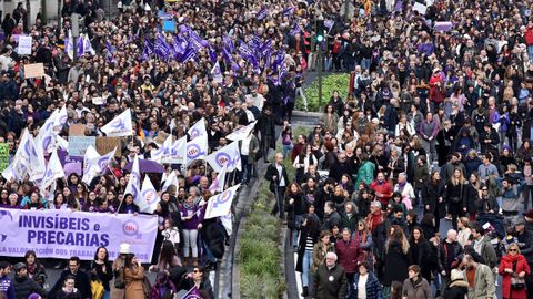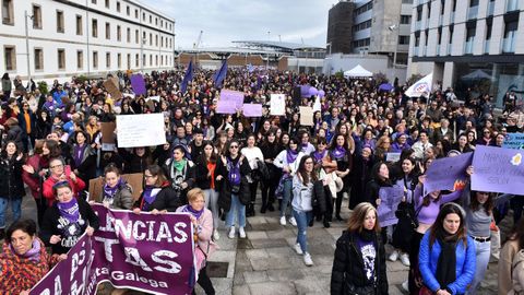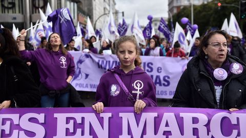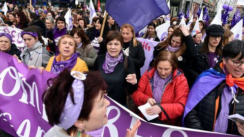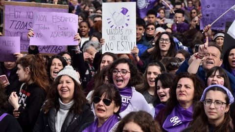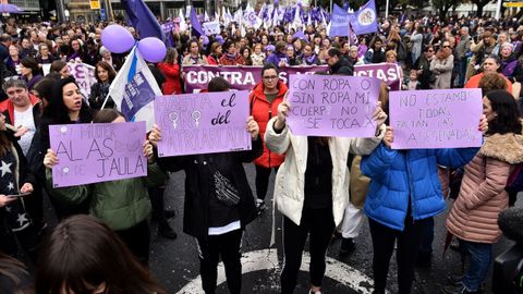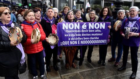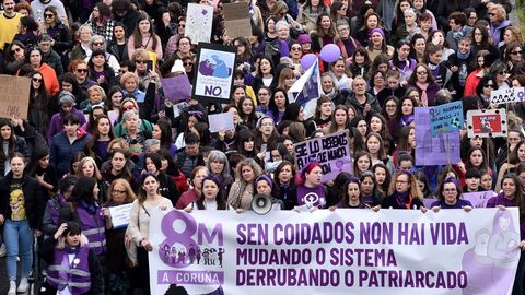 La manifestación de las mujeres en A Coruña discurrió como una fiesta. Hubo gaitas, panderetas, disfraces... Los cantos de los participantes de la marcha fueron diversos, aunque muchos se centraron en denunciar la lacra de las agresiones machistas, y los asesinatos: «Somos muchas, pero no estamos solas. Faltan las asesinadas». Unos ataques que compararon con «atentados, que acaban con nuestras vidas».