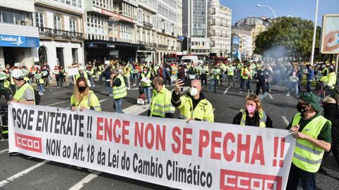 Más de un centenar de manifestantes detrás de una pancarta con el lema PSOE Entérate!! Ence non se pecha!! Non ao artigo 18 da Lei de Cambio Climático cortaron todos los carriles, tanto en sentido entrada conmo de salida, de la avenida de Linares Rivas, frente a la plaza de Ourense, lo que afectó a la circulación en la zona centro de la ciudad.