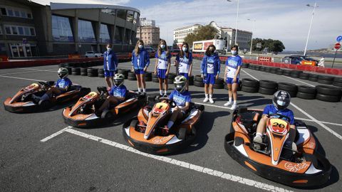 Las jugadoras del equipo cadete del Club Baloncesto Montrove estrenaron los karts instalados en la explanada del palacio de los deportes de Riazor