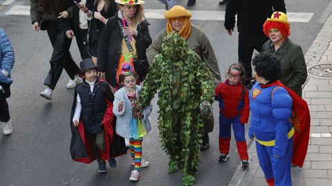 Después de años intentando escapar de los disfraces, el sábado cogí al minialosaurio con el que convivo y decidí que ya iba siendo hora de ver las comparsas. Igual se me pasa la alergia, pensé. Ya avanzo que no, se ve que es una condición genética resistente a cualquier tratamiento de choque. Y la esquina de San Andrés donde vimos pasar el desfile era lo más parecido a una terapia agresiva que puedo imaginar. No sé yo si el dinosaurio y la princesa medieval que nos acompañaba entendieron algo de todo lo que vieron, a pesar de nuestros esfuerzos en medio de semejante estruendo. Sospecho que jugar al pilla-pilla después del desfile les resultó mucho más divertido. Eso, y el atracón de Chaskis en la plaza José Sellier, que parece ser el único sitio donde sabemos acabar los días de fiesta. Esto está como en San Juan, dijo la madre de la princesa. Salvando las distancias, claro, porque en junio se ven pocas familias de avispones verdes, no hay gente convertida en un karaoke móvil ni se sienta a tomar una caña Braveheart. Nosotros aportamos dos princesas, un pirata y un alosaurio al jaleo generalizado, del que el dinosaurio y servidora huimos en cuanto mi alma de Grinch consideró que ya había cumplido con su parte de coruñesa adoptiva. Pero no desisto: el siguiente paso será mandar al retaco con su limitado repertorio de disfraces a pasar los próximos carnavales a casa de sus primas de Monte Alto, para que descubra que otro entroido (choqueiro, claro) es posible.