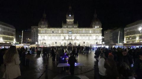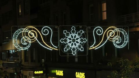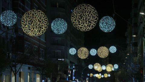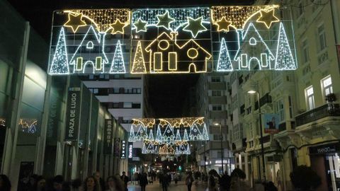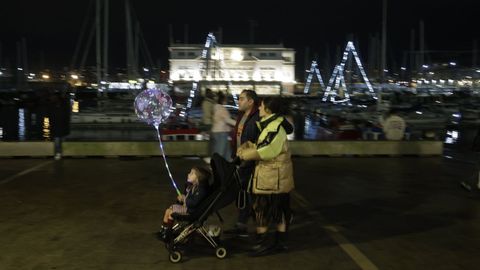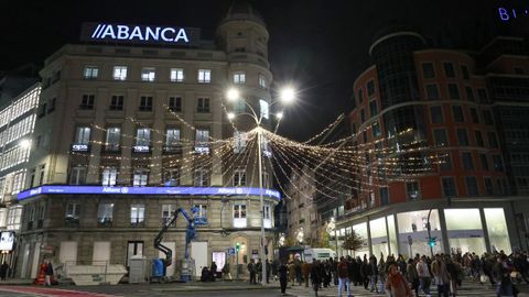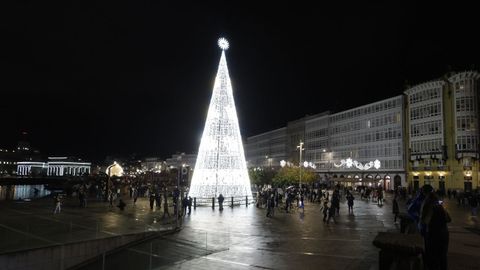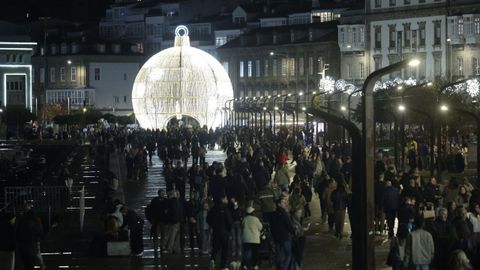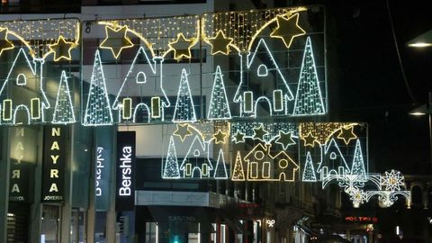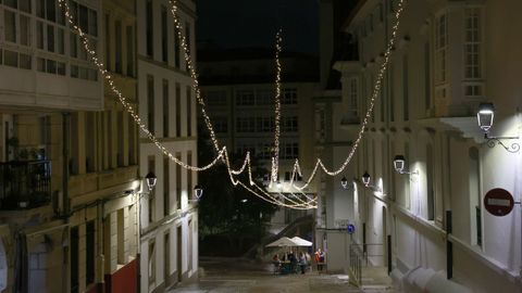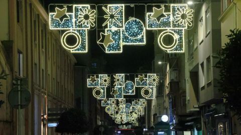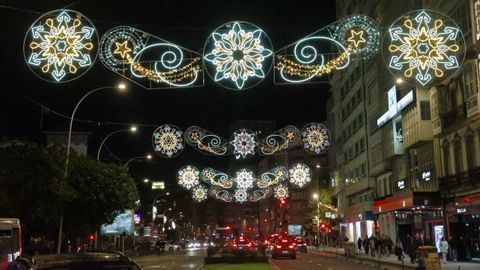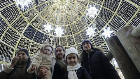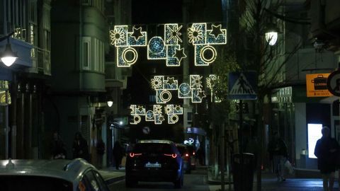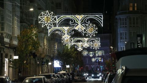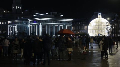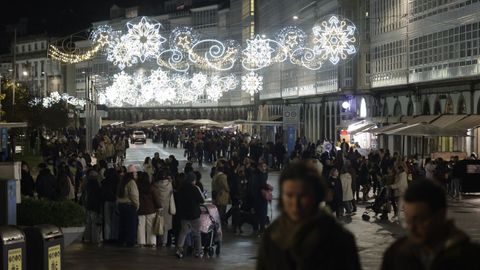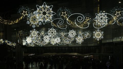 Las familias que paseaban vieron también prenderse los habituales techos de luces del centro, desde los velos tintineantes de la calle Real hasta los adornos y la bola de los Cantones, O Parrote o A Marina. Un encendido acompasado que fue como un pistoletazo de salida colectivo.
