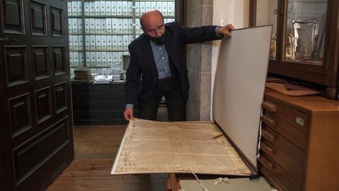 Ismael Velo muestra uno de los 27 libros corales del siglo XVIII que guarda en bolsas de plástico para intentar frenar su deterioro