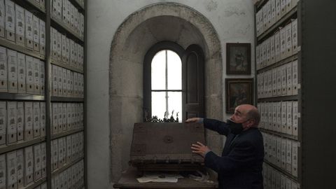 El canónigo y bibliotecario de la colegiata muestra una imagen de la virgen del Rosario que él mismo escondió por temor a que el vaciado de la imagen destruyera la policromía