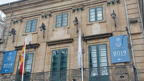Los escudos de la fachada son una copia de los existentes en la Porta da Vila. Cada uno de ellos está bajo una ventana. El primero, en la parte izquierda de la fachada, es un escudo sobre fondo azul con cinco copas de oro cerradas, timbrado con corona real. El del medio es un escudo timbrado por la corona real cerrada, en su interior se ve un castillo de oro de tres almenas sobre campo de gules, mamposteado de sable y clarado de azur, con un león rampante linguado. El tercer escudo de la fachada que será restaurado, el situado a la derecha del inmueble, es un escudo timbrado por la corona real, sobre campo azur, una torre de dos cuerpos de plata sostenida por un puente de tres arcos de idéntico metal, sobre aguas de río natural. Flaquean la torre seis roeles de oro.