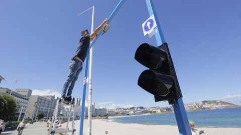 Los técnicos del Ayuntamiento trabajaban ayer para completar las instalaciones que regularán el acceso a las playas más céntricas. Los operarios se afanaron en instalar los módulos luminosos de los semáforos. Estos se ubican en los arcos recientemente colocados en las bajadas principales a los tres arenales.