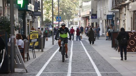 Unas líneas blancas sobre el suelo adoquinado inauguraron el nuevo paso para bicicletas y patinetes en la céntrica calle