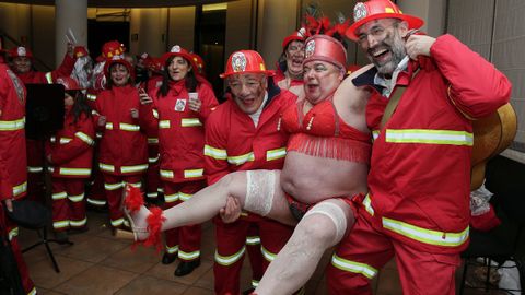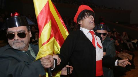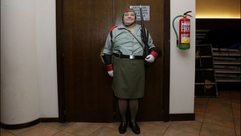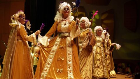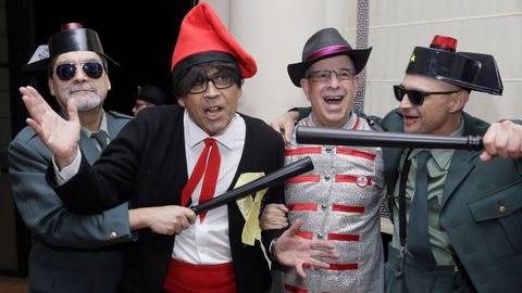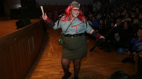 Los componentes de las comparsas se iban acumulando en los accesos al escenario del auditorio. Un bombero, un guardia civil. Un cura y un payaso. Un bufón, una dama victoriana y también un tipo con la cara pintada. Todo vale en carnaval para rescatar los acontecimientos del último año de una forma festiva, «pero sen olvidar a crítica social», señalaba Fernando todo serio vestido de guardia civil. «Hai que ter sentido do humor. Se nos quitan esto morremos de pena», decía medio de coña medio en serio. Había nervios, pero «isto é unha festa!», recordaba. De hecho, las comparsas reclaman que el concurso se celebre en sábado y no en domingo, porque la gente que trabaja «non pode seguir despois de troula por ahí», explican.