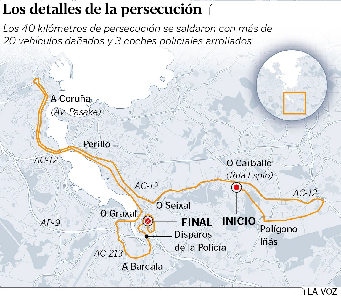 Según fuentes policiales, nada más emprender la huida, se internó en el polígono de Iñás. Sin respetar señales e invadiendo el carril contrario, obligando a muchos conductores a echarse al arcén para evitar el impacto. De ahí se incorporó a la N-VI en dirección A Coruña. Se saltó en rojo los semáforos de O Carballo e «hizo saltar el radar de Biona», destaca el atestado. Para continuar por Perillo a alta velocidad, esquivando los coches obligados a circular a 50. En ese tramo dañó a varios vehículos.