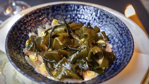 Pescados Rabina, su proveedor de confianza, le informa a diario de qué entró en lonja, y es ahí cuando la imaginación y la maestría de Summa Breogán echan a andar. «Cuando me dijo que había un erizo de Muros maravilloso, ni me lo pensé. Servimos el caparazón bien limpio con una velouté de pescado de roca y se corona con las gónadas del erizo. Es umami, yodo en el retrogusto, puro sabor…», asegura. Fue mientras estuvo en Culler de Pau, con Javi Olleros y Takahide Tamaka, cuando aprendió a tratar con delicadeza este producto. «Alguien tiene que transmitirte un legado, esa forma particular de ver la cocina. Y yo con ellos aprendí casi todo», añade.
