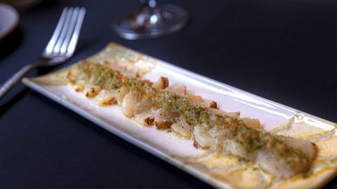 La propuesta gastronómica de este coqueto local, con una sala íntima y cuidada al detalle para hacer sentir al comensal como en casa, gira en función de la temporada y el producto, al que tratan con un mimo exquisito para crear platos con un enfoque personal que brillan con luz propia como el ajoblanco con sardina ahumada y piparra o el sashimi de vieira, una explosión de sabor a cada bocado. Mención especial merecen las croquetas, con una melosidad extrema, que se funden en el paladar. «Los asturianos son unos maestros del arroz con leche y las croquetas y tuve suerte de aprender de Nacho Manzano, uno de los mejores», comenta. Su secreto reside en una proporción exacta entre la leche y la roux (la mezcla de harina y materia grasa) que va reduciendo poco a poco a fuego muy bajo. Tiene dos opciones, una de quesos gallegos y otra de chorizo y castañas. Como elegir resultará complicado, lo mejor es probar las dos.
