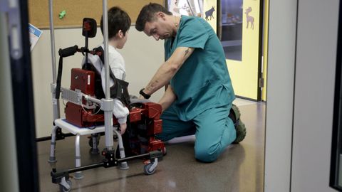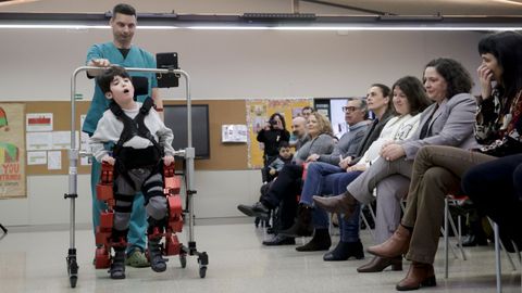 Víctor Chacón, de la empresa Marsi Bionics, explicó que este proyecto es fruto de tres años de investigación, que permitió crear el primer exoesqueleto pediátrico del mundo, inicialmente enfocado a la atrofia muscular espinal y que se utiliza para el tratamiento terapéutico de niños con parálisis cerebral y otras enfermedades neuromusculares. La firma nació como una spin off del CSIC y en el 2023 comenzó a comercializarlo. Actualmente hay 50 unidades en España y 70 en otros países. «Más allá de los beneficios clínicos, están los cognitivos», señaló, explicando que el aparato permite una marcha pasiva y automática, otra modalidad en la que levanta las piernas para que los niños realicen esfuerzo, y también la opción de marcha hacia atrás. Todo se maneja desde una tableta, que en el caso de Aspace Coruña utilizó el fisioterapeuta Santiago Carro.
