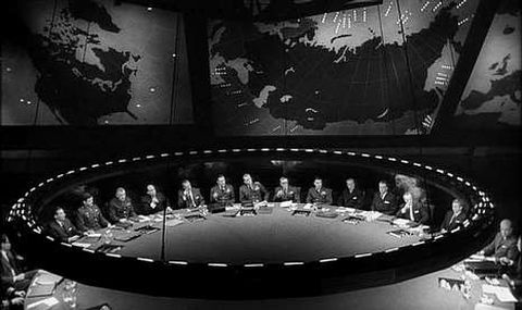 A veces a uno no le queda otro remedio que reírse de sus miedos. Aunque caiga en el terreno de lo que Kurt Vonnegut bautizó como humor de la horca al contar el chiste de un condenado al que llevan a la horca un lunes y comenta: «¡Vaya forma de empezar la semana!». Cuando no hay alivio posible, queda la risa. La versión cachonda del apocalipsis que plantea Teléfono rojo trata este asunto con la seriedad de un buen disparate. Se ríe del gran temor de su época y transforma en parodia el dilema nuclear y la paranoia de la guerra fría. A tal punto llegaba la chifladura americana que a menudo convertían las películas de serie B en alegorías de la invasión roja, con los marcianos ejerciendo de comunistas. La obsesión como paso previo a la estupidez. El general chalado de esta película pone en marcha un dispositivo para atacar Rusia. Coloca al mundo en el precipicio de la destrucción atómica y nos traslada a una sala de guerra -un decorado grandioso- con una mesa circular en la que los dirigentes que toman las más altas decisiones juegan al póker con el destino del mundo. Aquí comprobamos que Teléfono rojo no ha envejecido nada, no tiene arrugas. El contexto histórico de su época ha desaparecido. Sin embargo, si uno mira hacia las mesas de póker actuales en Bruselas, por ejemplo, comprueba que han pasado décadas y seguimos en el mismo kilómetro. Todo es tan absurdo que si hubiese que rodar una película sobre la crisis actual, solo podría ser absorbida y retratada como una comedia. Con el mismo esperpento y la majadería de esta película de Kubrick: peor aún que las bombas de hidrógeno son los retrasados que están a cargo de ellas. «La estupidez se heredará hasta que desaparezca la especie, que desaparecerá por estúpida», asegura José Luis Cuerda. Cuando Reagan se convirtió en presidente pidió ir a ver la sala de guerra de la Casa Blanca. Su jefe de Estado Mayor le dijo: «Señor presidente, no hay ninguna sala de guerra en la Casa Blanca». Reagan añadió: «Pero si la vi en esa película, Teléfono rojo». Es razonable pensar que Reagan ignoraba que las películas con frecuencia se ruedan en decorados. Total, solo fue actor durante 27 años y figurante el resto de su vida. Por qué hay que verla Por el trabajo de Peter Sellers, que interpreta a tres personajes. Si le dejan, hace la película él solo Por la escena en la que el piloto cowboy del B-52 cabalga una bomba atómica. Toda una apología del hongo nuclear Por el gag en el que necesitan 20 centavos para salvar al mundo con una llamada de teléfono y un soldado se niega a romper una máquina de Coca Cola para extraer una moneda