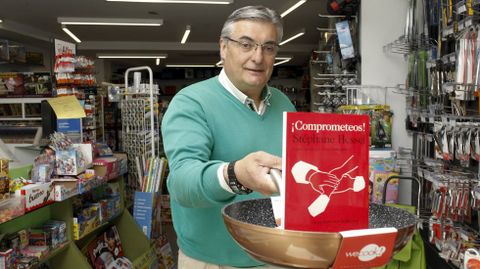 María del Carmen lo tiene claro: apenas vende libros. Le quedan unos cuantos ejemplares y, cuando se vayan a alguna casa, en la ferretería ya no habrá más libros, salvo los que lleguen con las revistas y periódicos. Faltan clientes para los ejemplares de papel, pero funciona muy bien, asegura la dueña, la venta de periódicos y revistas. Sin embargo, el caso de Miguel Ángel Corredoira Real es diferente. Fue en busca de un libro que ya no encontraba en otros lugares y acabó llevándose una sartén porque tenía un buen precio. Corredoira, vecino del barrio, fue a por ¡Comprometeos!, de Stéphane Hessel, para hacer un regalo. Corredoira es uno de los ciudadanos más comprometidos de Lugo. Esta última semana recogió cientos de firmas para reclamar la mejora de la N-VI a su paso por O Corgo y anteriormente fue uno de los activistas de la campaña para conseguir el servicio de radioterapia en Lugo y también la hemodinámica para el Hospital Lucus Augusti. «Conseguimos case 44.000 firmas», recuerda Corredoira. «Como di Hessel no seu libro, xa non basta con indignarse. ¡É preciso pasar a acción!».