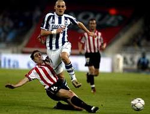 14 feb 2004 . Actualizado a las 06:00 h.Gurpegui volvió al estadio donde dio positivo en la primera jornada de la pasada Liga y no acabó el derbi vasco de su regreso porque fue expulsado por dos entradas a Xabi Alonso, pero la Real Sociedad fue incapaz de aprovecharse de la ausencia del centrocampista navarro del Athletic durante más de media hora. Real y Athletic se repartieron los puntos en Anoeta y los bilbaínos, aunque empatados con el Barça, continúan en la quinta plaza, mientras que los donostiarras se quedan a cinco puntos de Europa, aunque fracasaron en la segunda mitad ante la poblada y efectiva defensa visitante. El gol de Nihat al final de la primera parte para conseguir el empate definitivo hizo sin embargo justicia, porque antes de que Yeste marcase por cuarto partido consecutivo en la primera llegada del Athletic, la Real llegó a mandar dos balones consecutivos a los postes. En un minuto ambos palos repelieron los remates de Kovacevic y Xabi Alonso durante los momentos de mayor decisión ofensiva de la Real, que siempre atacó por la derecha con Karpin y el ruso le ganó la partida a Larrazabal en el primer tiempo. En las segunda parte, los donostiarras se volcaron sobre la meta bilbaína, pero les faltó la fortuna en ataque que mostraron la pasada campaña.
