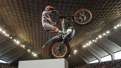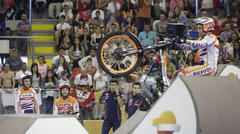 Ya en el Palacio, Bou, Busto y Fujinami dejaron ojipláticos a los asistentes con sus habilidades en el circuito de trial instalado para la ocasión. La gente enardeció con la entrada en escena de Márquez y Pedrosa, quemando rueda, y convirtiéndose en juez y parte del concurso que adjudicaría una escúter a al afortunado y habilidoso Abel.