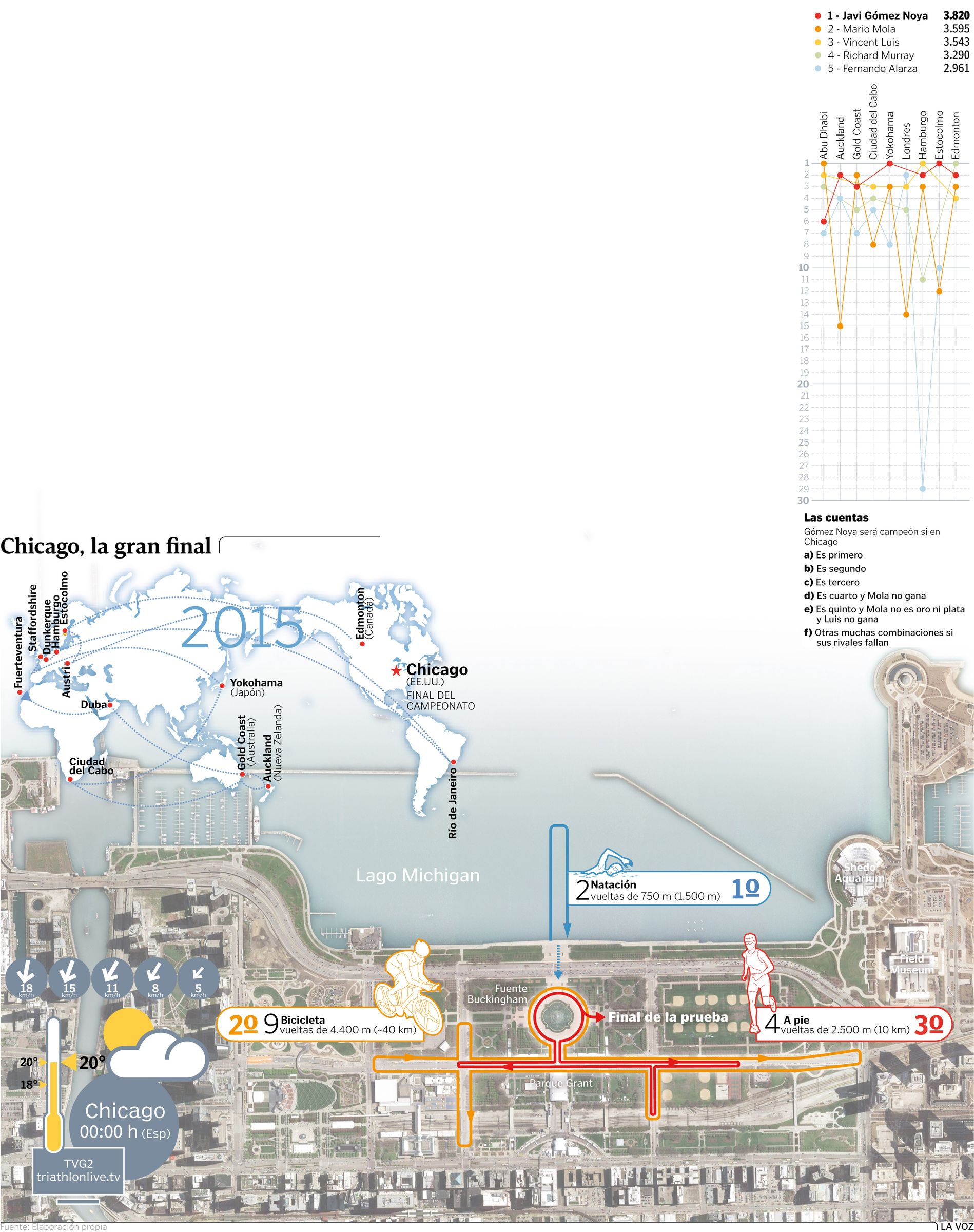 19 sep 2015 . Actualizado a las 19:55 h.Después de varios días con el tiempo revuelto -hasta tal punto que el recorrido de algunas pruebas en categorías menores se vio alterado por el estallido de varias tormentas- está previsto que hoy vuelva a salir el sol en Chicago, el escenario de la Grand Final de las Series Mundiales de triatlón (00.00 horas, TVG2) y donde Javier Gómez Noya (Basilea, 1983) buscará algo inédito en la historia del deporte de las tres disciplinas: coronarse por quinta vez. El ferrolano trata de pisar terreno inédito, despegarse de Simon Lessing, el único que comparte con él el privilegio de recibir los honores de un tetracampeón. Desde su atalaya, el horizonte se ve despejado. Es una lucha contra sí mismo, una batalla frente al tiempo y el hastío de ganar. Por el momento, sus ganas de perdurar parecen inagotables.