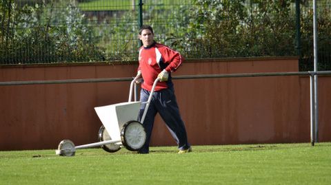 Después pinta el campo. Para ello utiliza un carretillo que ya tiene años. Antes se empleaba cal, pero ahora no hay y lo que se pone para delimitar las líneas del terreno de juego es yeso. La empresa Almacenes Arjomil aporta desinteresadamente esos dos sacos cada semana y durante la temporada. Son 30 kilos y treinta minutos que le lleva la labor.