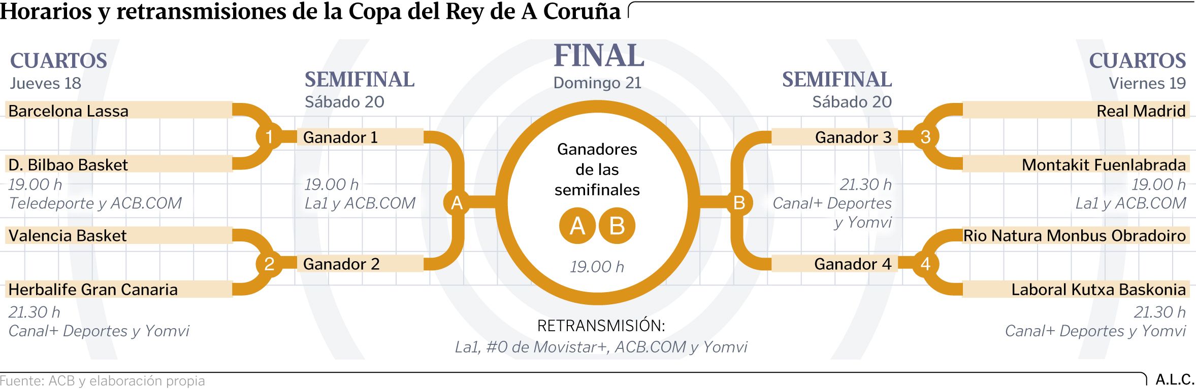 18 feb 2016 . Actualizado a las 14:47 h.Xavi Pascual no se esconde. Sabe que el Barça entra en todas las quinielas para estar en la final de la Copa del Rey que hoy arranca en A Coruña y asume la responsabilidad. Porque, pese a la baja de Lawal, que ayer pasó por el quirófano para operarse de la rotura del menisco externo de la rodilla derecha, el abanico de recursos de los azulgrana parece de ciencia-ficción. La polivalencia de Doellman, la creatividad de Arroyo -que acaba de entrar en las rotaciones después de superar su lesión-, el acierto de Pau Ribas, la batuta de Satoransky, la jerarquía de Ante Tomic y, por su puesto, la magia de Juan Carlos Navarro configuran un repertorio difícil de igualar en el baloncesto europeo. Esa álbum de estrellas será el encargado de abrir el torneo en el Coliseum, en el regreso de la competición a Galicia. En frente, el Dominion Bilbao Basket, un bloque donde la experiencia es un grado. Hervelle, Raúl López y un eterno Mumbrú son armas suficientes como para darle un susto a cualquiera.