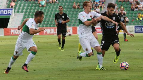 El Elche pisó el césped con la intención de hacer daño en las contras, pero el Lugo pronto se adueñó del partido con un despliegue de verticalidad, precisión y potencia. Joselu tuvo la primera clara al cuarto de hora, en una pelota que llegó hasta él en solo tres pases desde la zaga. La colocó Iriome desde la banda y el delantero la mandó a las manos de Juan Carlos. Pedraza a los dos minutos pescó una genialidad de Pita por dentró y disparó a puerta aprovechando la intervención de Pelegrín, que se tiró con todo intentando despejarla y la empujó para dentro. Campillo subió el segundo fusilando a Juan Carlos gracias a un regalo de Pedraza al borde del área.