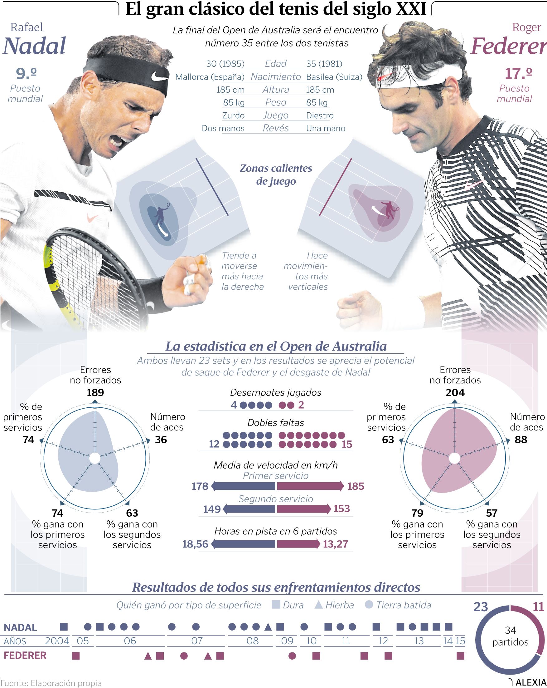 29 ene 2017 . Actualizado a las 05:00 h.Estamos ante una final maravillosa para el tenis y el deporte. Nadal parte con el condicionante del desgaste del viernes, y que Federer ha tenido un día más de recuperación al jugar el jueves. Pero creo que el español se recuperará bien. Seguro que habría preferido un duelo más suave en semifinales, pero también es cierto que el partido ante Dimitrov le ha servido como un entrenamiento excepcional de cara a hoy. Porque el juego del búlgaro y el del suizo se parecen como dos gotas de agua. En ese sentido ha sido un ensayo fantástico.