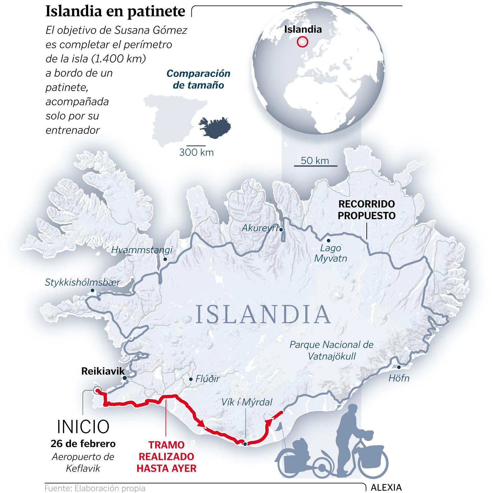 04 mar 2017 . Actualizado a las 13:54 h.Son las cuatro de la tarde del miércoles y Susana Gómez Castiñeira (Cee, 1975) y su acompañante, Sergio Espinosa, deciden hacer un alto en el camino y reponer fuerzas con una pizza en la localidad islandesa de Hvolsvöllur. Por delante quedan 200 kilómetros de tierra inhóspita por recorrer en patinete. Sí, en patinete. Se trata del último reto de esta deportista de Cee que vive en Lanzarote.