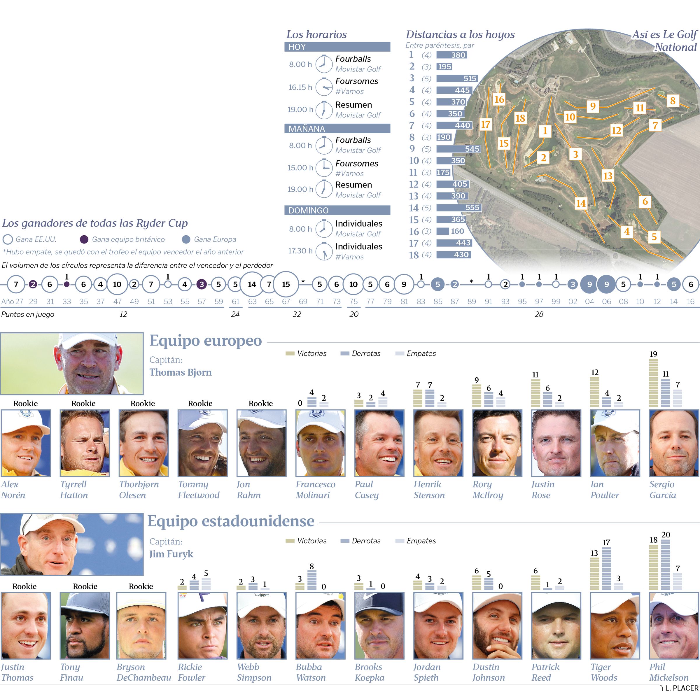 «La fuerza de Europa es que hemos estado muy unidos y, aunque haya diferencias, las dejamos fuera. Así nos suele ir bien en los últimos años», explica el norirlandés Rory McIlroy, ganador de cuatro grand slams. Ya en su quinta Ryder con solo 29 años, forma junto al danés Thornbjorn Olesen la segunda pareja europea. Se medirán con otro tándem americano potentísimo, con el número uno mundial, Dustin Johnson, y Rickie Fowler, el 9.